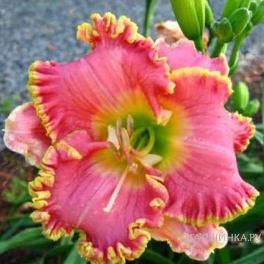 Лилейник Дивас Чойс– травянистый корневищный многолетник. Высота растения: до 60 см. Цветы крупные диаметром до 17 см кораллово-розовые с желтыми гофрированными краями и зеленым горлом. Полувечнозеленый, тетраплоид, повторноцветущий.