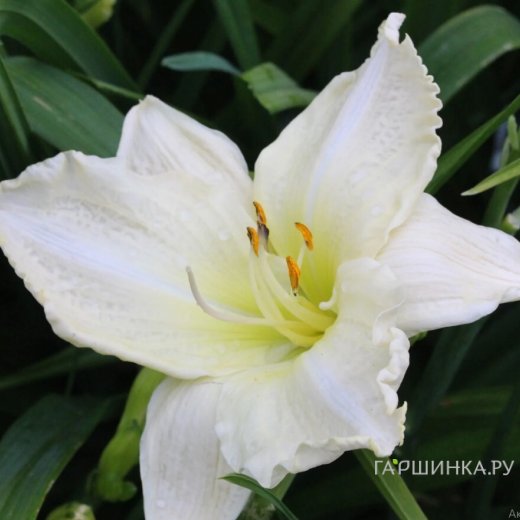 Лилейник Джоан Сеньор– травянистый корневищный многолетник. Высота 60 см. Цветы диаметром 15 см белые, лепестки текстурные широкие с лимонной сердцевиной, они отогнуты наружу. На лепестках образуются прожилки почти такого же цвета, как и сам цветок, лишь слегка выделяясь. Редкий сорт с ремневидными листьями темно-зеленого цвета. Повторноцветущий. Вечнозеленый диплоид.