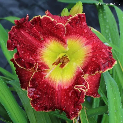 Цветок красного цвета, края белые, сильно гофрированные. Диаметр до 13 см.