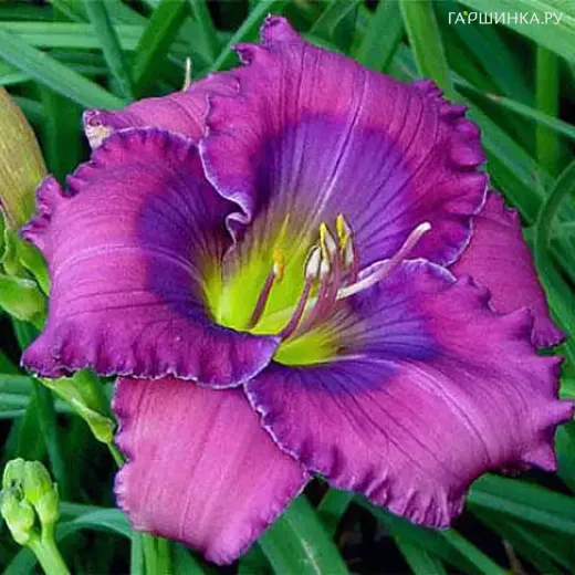 Лилейник Лавандер Блю Бэби– травянистый корневищный многолетник. Высота растения: 60-65 см. Диаметр цветка: 14 см. Цветок гофрированный, ярко-сиреневый с фиолетовым кольцом и каймой, зеленое горло. Период цветения июль-август. Ароматный; повторное цветение.