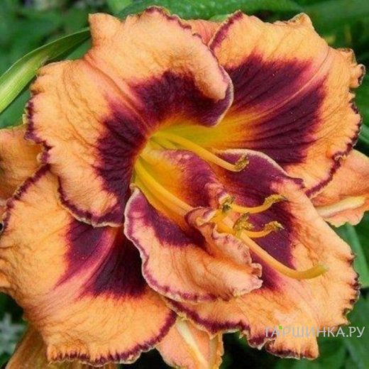 Лилейник Эксплодед Пампкин– травянистый корневищный многолетник. Высота растения: до 65 см. Диаметр цветка 15 см. Цветок ярко-оранжевый, с бардовым глазом и слегка волнистой каймой того же цвета. Полувечнозеленый, тетраплоид. Цветение конец июня - август.