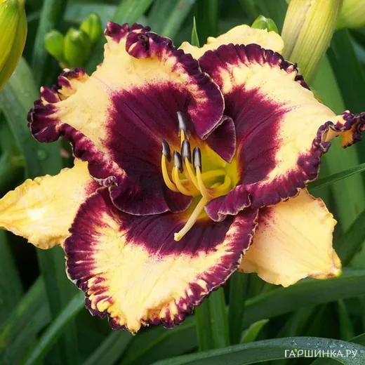 Лилейник Опен Май Айз– травянистый корневищный многолетник. Высота 60 см. Цветки гофрированные, 15 см диаметром, кремово-бежевые, с насыщенным винным глазом и каймой, горло зеленое. Вечнозеленый, повторноцветущий, тетраплоид. Цветение в июле.