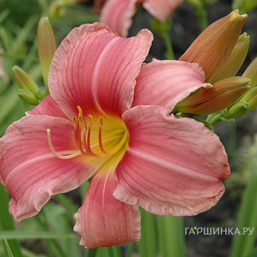 Лилейник Прэйри Белс– травянистый корневищный многолетник. Высота: 50-60см. Цветок 11см. Большие волнистые цветы розового-красного цвета с желтым горлом.Время цветения июнь-июль.