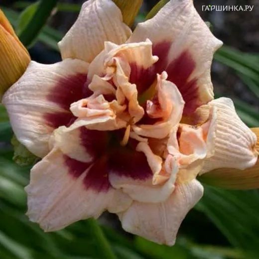 Лилейник Росвита– травянистый корневищный многолетник. Высота растения - 35 см; диаметр цветка - 8 см. Персиковый цветок с фиолетовым глазом, махровый. Зеленое горло. Цветение: среднеранний (конец июля).