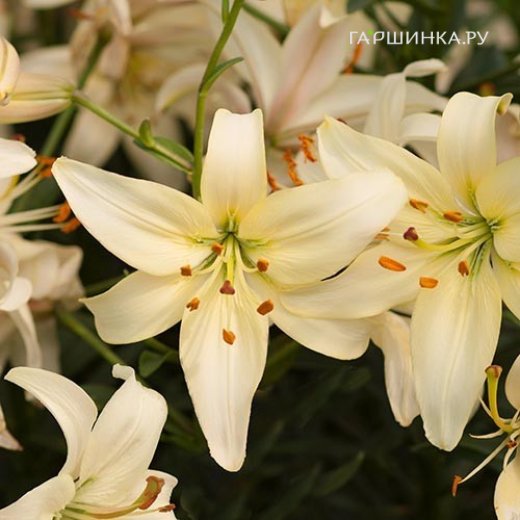 Лилия Перл Франсес - Куст плотный, лист узкий, зеленый. Цветки лилиецветные, 20 см, воронковидные, одиночные, или собраны в раскидистые пирамидальные соцветия, расположены на конце цветоноса, лепестки цветка восковидной фактуры. Цветение обильное и продолжительное, декоративность сохраняется до конца осени, есть тонкий приятный аромат. Высота растений 1,20 м, окраска цветка белая, центр чуть зеленовато-желтый, пыльники темно-коричневые. Зона зимостойкости 4.