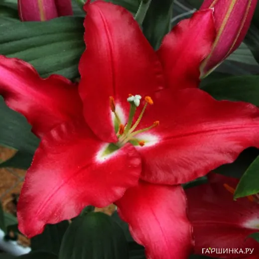Лилия Тачстоун ОТ-гибрид темно-розовая - Высокорослый сорт с очень крупными рубиновыми цветками с желтым центром. Цветок 25 см в диаметре. Высота: 140 см. Аромат сильный. Период цветения: июль.