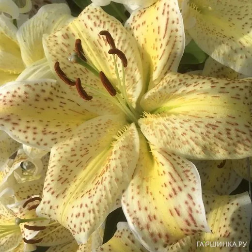 Лилия Тайгермун восточная - Цветки кремовые с желтыми продольными полосами по центру лепестков и c темно-красным частым крапом по всей поверхности лепестков. Высота 130 см. Цветки 20 см в диаметре. Насыщенный сильный аромат. Цветет в июле.
