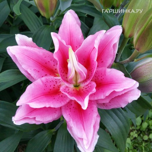 Лилия Роузлили Виола — эффектная восточная махровая красавица, которая станет настоящим украшением любого сада. Крупные бутоны диаметром до 17 см окрашены в розово-карамельные тона с тёмно-розовой серединкой и тонким крапом. Нежный, не приторный аромат придаёт цветению особую изысканность, а многолепестковая структура цветка создаёт впечатление пышного ковра. Высота растения достигает около 100 см, поэтому лилия смотрится выразительно как в одиночных посадках, так и в групповых композициях.
