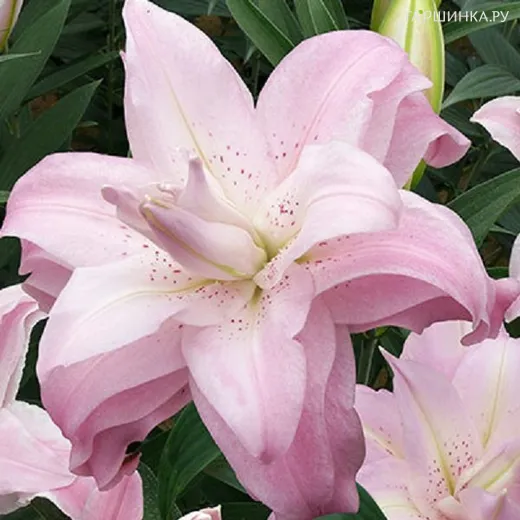 Лилия Лотус Квин восточная махровая - Цветки нежно-розового цвета с легким краппом и волнистым краями лепестков. Цветок густомахровый. Высота 110 см. Стебли прочные, облиственные. Цветки лилии 21 см в диаметре. Насыщенный аромат. Период цветения июль-август.