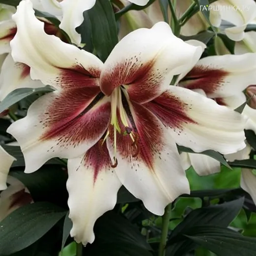 Лилия Зеба ОТ-гибрид - высокорослый сорт с очень крупными белыми цветками., с малиново-винным центром. Диаметр цветка 25 см. Аромат сильный. Высота : до 110 см. Период цветения: июль.