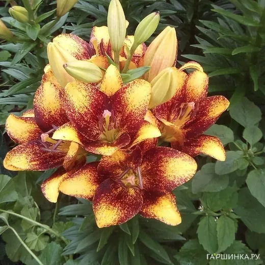 Лилия Свит Вэлли ЛА-гибрид/2 шт - цветок желтый (ярко-золотой) с бордовым плотным крапом. Высота лилии достигает 130 см. Цветки у сорта крупные. смотрящие вверх, диаметр которых около 20 см. Предпочитает солнечные участки. Период цветения - июль-август.