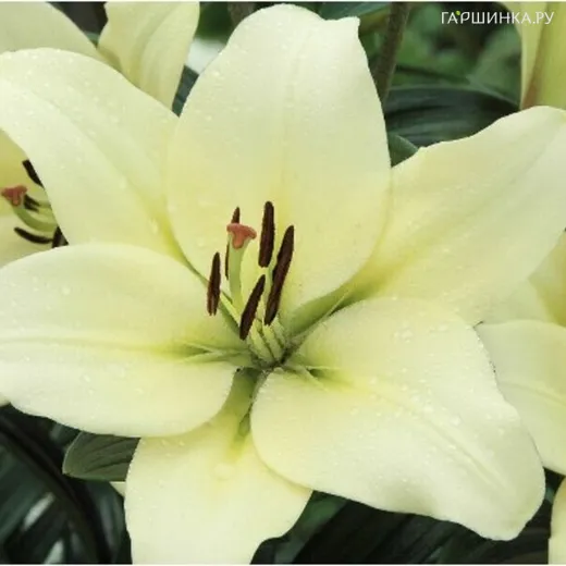 Лилия Требиано Геррит Залм ЛА-гибрид - крупные и яркие цветы, диаметр бутона составляет до 21,5 см. Они лимонно-зеленого цвета, который постепенно тускнеет и становиться практически белым. Растение достигает 1,1 м в высоту.Стебель крепкий и прямой, листья темно-зеленые. Цветение в июле-августе.