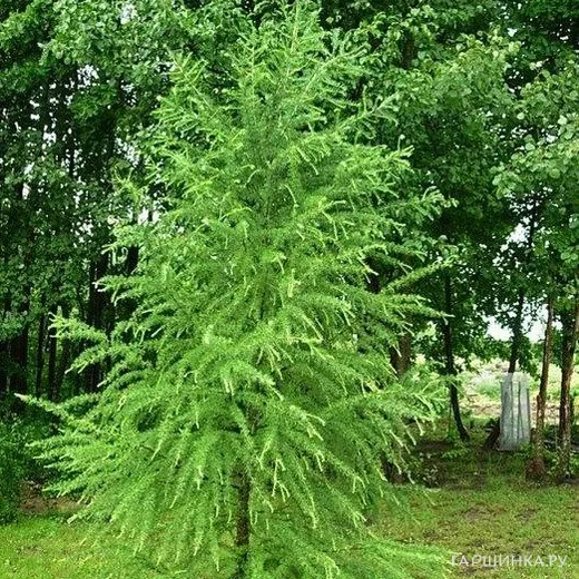 Лиственница Кемпфера - Лиственница японская, тонкочешуйчатая. Красивое быстрорастущее дерево до 35 м высотой. Дерево с широкопирамидальной кроной с длинными, почти горизонтальными ветвями и длинными сизо-зелеными хвоинками. Хвоинки длиной до 5 см, светло-зеленые. Осенью окрашивается в ярко-желтый цвет. Шишки в молодости желтовато-зеленые, шаровидные,  с тонкими чешуями, отогнутыми в верхней части подобно лепесткам роз, сохраняются на ветвях до 3 лет.