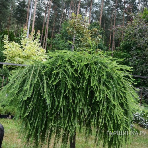 Лиственница европейская Пендула на штамбе 150см - декоративное, листопадное, хвойное растение. Высота определяется штамбом, форма кроны подушковидная, компактная, разраcтающаяся. Побеги направлены горизонтально, плотные, концы поникающие, хвоя игольчатая, сине-зеленая, осенью золотистая, на зиму опадающая. Шишка овально-продолговатая, красно-фиолетовая, созревая коричневая, мелкая.