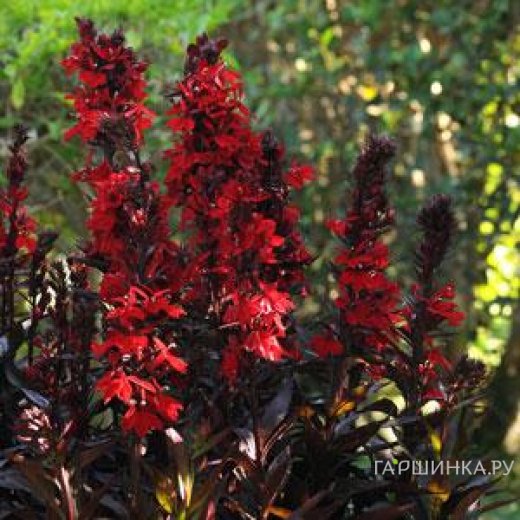 Лобелия Красный вулкан -оригинальный многолетник с декоративной бронзовой листвой, формирующий колос с ярко-красными многочисленными цветками. Высота растения 60-80 см. Прочные, хорошо разветвленные стебли не нуждаются в подвязке.