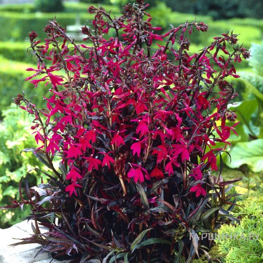 Лобелия Русская Принцесса - великолепное растение семейства Колокольчиковые, высотой 80-90 см, усыпанное яркими, крупными (до 3 см в диаметре), необычными цветками и с эффектной темно-пурпурной листвой, всегда находится в центре внимания садоводов. Цветки яркие вишнёво-красные, отлично подходят для срезки. Лобелия прекрасная Русская Принцесса выращивается в рабатках и включается в ковровые композиции.