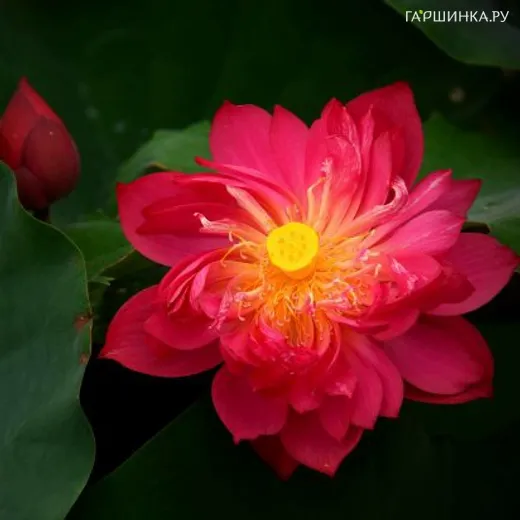 Лотос красный - красная кувшинка развивает мощное корневище, имеет длинные стебли, на которых размещены сердцевидные листья. Красный лотос характеризуется красными цветами, которые торчат на высоте 20-30 см от плавающих листьев.