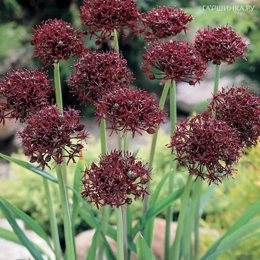 Лук декоративный Atropurpureum - широко известное декоративное растение, цветущее в июне 11-18 дней. Его почти идеально круглые зонтики имеют в диаметре около 7 см. В центре цветков звездчатой формы винно-красной окраски располагаются эффектные темные пыльники, расположенные на пурпурных тычинках. Стрелки поднимаются на высоту от 40 до 70 см. Листья линейные, короче цветоноса. Зона зимостойкости 3 (- 40 С)
