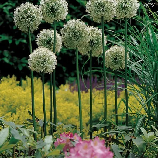 Mount Everest - это декоративный лук с крупными белыми цветками и длинными стрелками, вырастающими до 120 см. Листья красивой формы сохраняются зелеными долгое время. Сферические зонтики диаметром 15 см состоят из нескольких десятков белых звездчатых цветков. Зацветает в июне. Зона зимостойкости: 4 (-35 С).
