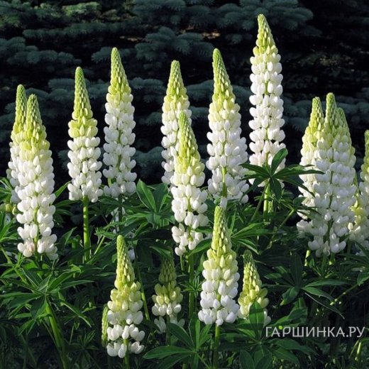 Люпин Ноблмейден - белоснежные соцветия, длиной до полуметра.