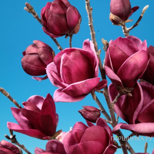 Магнолия Дженни - красивый сорт с темными, глубоко насыщенно бордовыми-красно бокаловидными крупными цветами с 6-12 лепестками (до 15 см длиной), которые появляются ранней весной до появления листвы. Бутоны почти черные. Цветет с середины весны до начала лета. Форма растения вертикальная, компактная, разветвлённая. Высота до 3 м. Рост медленный. Цветы появляются рано, уже с 2 лет. Листья расположены поочерёдно, эллиптические или обратнояйцевидны.