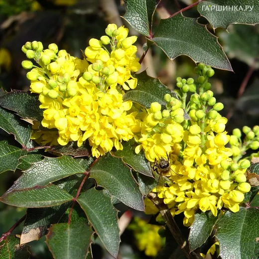 Магония падуболистная Смарагд - декоративный, неприхотливый, вечнозеленый кустарник. Куст прямостоячий, раскидистый 0,9 м. Лист сложный, непарноперистый, острозубо-выемчатый, ширина 0,25 см, длина 9 мм, темно-зеленый, зимой-красный, кожистый, блестящий, черешок красный. Соцветие метелковидное, цветочки мелкие, бледно-желтые, с лимонным отливом, 0,8 см. Плод продолговато-эллиптическая ягода, черно-синей окраски, на поверхности густой налет - покрытие сизого цвета и пушка.