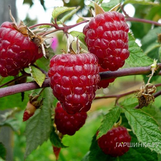 Ягоды крупные конусообразной формы, имеющие вес до 12 г. В первый год растения плодоносят не очень обильно и могут приносить круглые плоды, что не является отклонением от нормы. Мякоть малины достаточно плотная, в которой хорошо чувствуется присутствие семян. Аромат плодов насыщенный, свойственный малине. Вкус десертный с лёгкой пикантной кислинкой. Окрас ягод насыщенно-малиновый, у некоторых с небольшим сизым налётом.