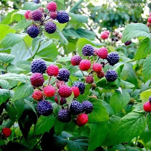 Малина Кумберленд черная - Кусты широкораскидистые, состоят из 8-10 побегов длиной до 1,5-1,8 м. Плодоношение растянуто до четырех-пяти недель. Ягоды крупные, сладкие, в кистях держатся довольно плотно. Рост побегов начинается ранней весной, когда достаточно влаги после таяния снега. Затем наступает плодоношение. После снятия урожая идёт вторая волна роста и вызревания побегов. Происходит это после полива или начала осенних дождей: в сентябре-октябре. Урожайность в 1,5-2 раза превышает лучшую красную малину, а ягоды намного богаче микроэлементами и фруктозой.