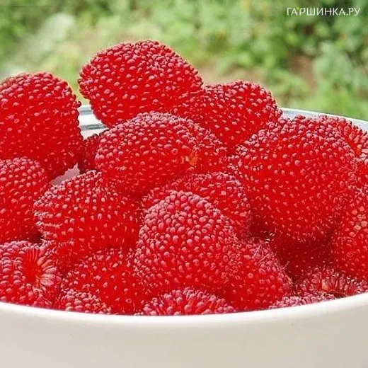 Малина тибетская (земляничная) - Это округлый полукустарник от 30 до 60 см высотой, с ползучим корневищем, дающим новые побеги на расстоянии более полуметра от куста, образует заросли. Имеет несколько вертикальных травянистых стеблей с зеленой корой, древеснеющих лишь у самого основания. Листья очередные, черешковые, перистые, состоят из 3-7 зубчатых по краю продолговато-ланцетных листочков 3-8 см длиной. Стебли и черешки листьев покрыты загнутыми цепляющимися шипами. Цветки довольно крупные, пятилепестные, 2,5-4 см диаметром, белые, обоеполые, в малоцветковых соцветиях, расположенных на верхушках стеблей, иногда одиночные. Очень декоративны плоды - сочные многокостянки 3-4,5 см диаметром, округлой или широкоэллиптической формы, светящегося кораллово-красного цвета. Размером и внешним видом они, действительно, напоминают клубнику, но легко отделяются от цветоложа, как малина. По вкусу они не похожи ни на ту, ни другую ягоду, кисло-сладкие и слегка ароматные. Зрелые ягоды можно собирать до осени, так как эта малина даёт плоды до самых заморозков. Сорт подходит для домашних заготовок и виноделия. Сорт неприхотлив, морозостоек, практически не поражается болезнями и традиционными для малины вредителями.