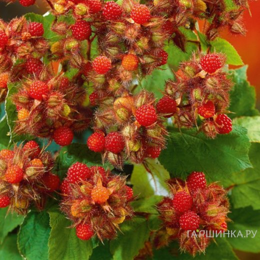 Малина японская - Этот небольшой очень агрессивный среднерослый плетистый полукустарник достигает в высоту от 200 см. Листья красивые, слегка морщинистые, малахитово-зеленые, нижняя сторона светлая, словно серебристо-белая «велюровая подкладка». Начинает цвести в начале лета, когда возвратные заморозки не угрожают садам. Цветки до 1 см в диаметре на коротких цветоножках, покрытых рыжевато-пурпурными щетинками и такими же щетинистыми чашелистиками. Лепестки легких розовых или пурпурных оттенков. Цветки собраны в плотные кистевидные соцветия на концах боковых побегов. Плоды около 1 см в диаметре, блестящие, яркие, от карминно- и пурпурно-красных до насыщенных темно-вишнёвых, сладкие, с уникальным тонким ароматом лесных ягод. С ягодами делают всё то же самое, что и с плодами обычной малины: употребляют в свежем виде, заготавливают варенье, джемы, желе, компоты, соки, начинки для пирогов.