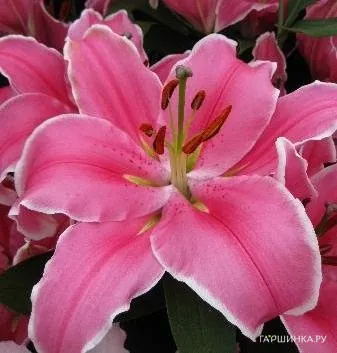 Лилия Марлон восточная /2шт - Цветки насыщенно-розовый, ровный цвет с тонкой белой каймой. Высота 110 см. Стебли прочные, облиственные. Цветки 22 см в диаметре. Нежный стойкий аромат. Период цветения июль-август.