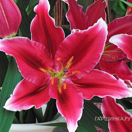 Лилия Метрополитен восточная/2шт - Цветок малиново-красный с белым кантом. Высота 110-130 см. Стебли прочные, облиственные.  Цветки 16-20 см в диаметре.  Нежный стойкий аромат. Период цветения  июнь-июль.