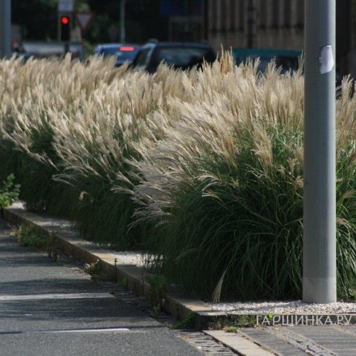 Мискантус Якушима Дварф - Декоративный злак, отрастает поздно весной, образует густой и компактный куст. Листья длиной 80 см, очень узкие, зелёные, грациозно сгибаются вниз. Цветки крошечные, светло-коричневые, очень декоративные, в пушистых метёлках, к зиме становятся кремово-белыми.