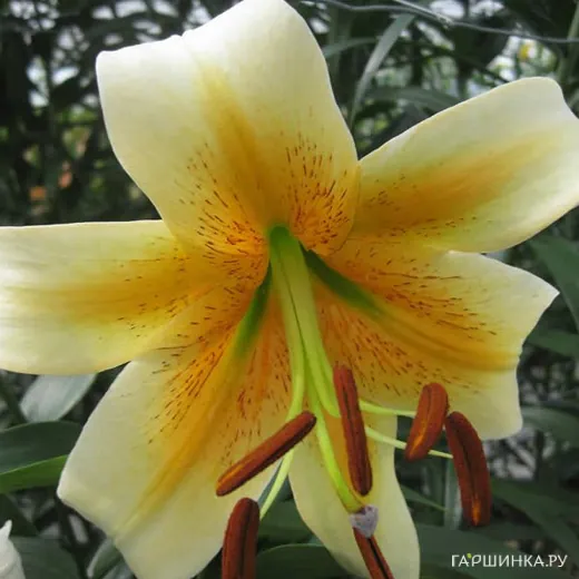 Лилия Мистер Кас ОТ-гибрид - цветки бело-желтые, очень крупные, направленные вниз. Лепестки волнистые, они элегантно загибаются назад, открывая желто-оранжевый центр с продолговатыми пятнами. Высота растения до 90-120 см. Со временем эта лилия превратится в настоящего гиганта с 20 душистыми цветками около 20 см в диаметре.