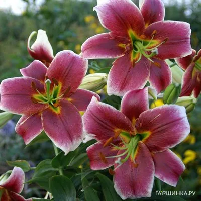 Лилия Мистер Джоб ОТ-гибрид/2шт Цветки диаметром 21 см, бордово-коричневые с яркой зелёной звездой в горле и кремовой полосой по краю. Наружные лепестки длинные, кончики почти белые, причудливо загибаются при полном раскрытии цветка. Цветки направлены вниз или в сторону. Зацветает в июле-августе. Имеет сильный аромат. Высота растения 120 -150 см. Зона зимостойкости: 4 (-35 ° С).