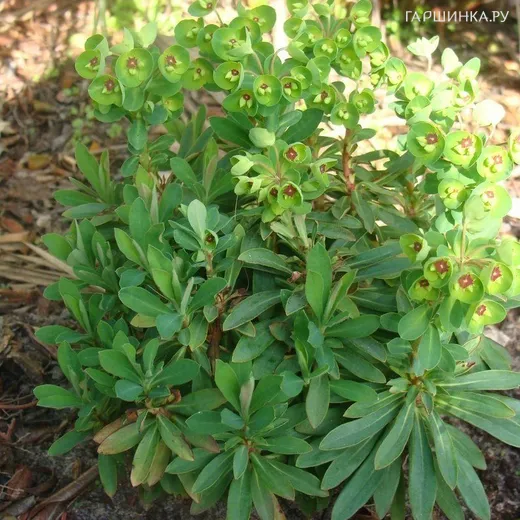 Молочай Мартина - гибридное травянистое растение, применяющееся для озеленения сада. Кустарник обильно покрыт узкими серо-зелеными листьями, которые придают ему куполообразную форму. В мае-июне распускаются мелкие зелено-желтые цветки с красными или бордовыми глазками. Взрослое растение имеет одинаковую высоту и ширину – 50 см, что придает ему аккуратный вид.