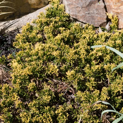 Можжевельник Мазер Лод горизонтальный - стелющийся сорт, карликовая форма с ползучими побегами, высота 20 см, ширина 200 см. Имеет мелкую яркую золотисто-желтую листву весной и летом, которая зимой приобретает бордово-сливовый оттенок. На солнечных или слабо затенённых местах хвоя интенсивно-золотистая. К почве нетребователен, место солнечное или полутень. Используется как почвопокровное растение, для выращивания в контейнерах, посадки группами на откосах и в каменистых садиках, морозостойкость до -34°С.