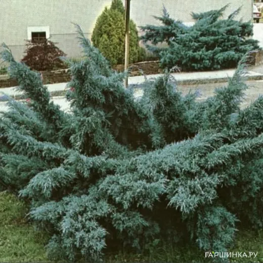 Можжевельник средний Пфитцериана Глаука голубой - Вечнозелёный широкораскидистый кустарник. Крона изначально распростёртая, затем приподнятая, концы побегов изящно свисающие. Хвоя игловидная и чешуевидная, сизо- голубая на солнечном месте до серо-зеленой в полутени, зимой с небольшим пурпурным налетом в зимнее время. Скорость роста умеренная, в высоту достигает 2-3 м., в ширину – 3-4 м. Размер: в возрасте 10 лет высота - около 1 м при диаметре 3-4 м. К почвам нетребователен, растёт на всех видах почв, от сухих до влажных, кислых и щелочных. Очень морозостойкий и засухоустойчивый сорт, устойчив к городскому климату и вредным выбросам, хорошо стрижётся. Рекомендуется для одиночных и групповых посадок на фоне газона, альпинариев, каменистых участков, озеленения балконов и крыш, выращивания в контейнерах, для парков и больших садов. Зона зимостойкости 5a до( -28.8 °C)