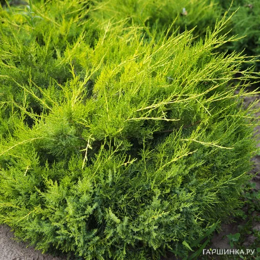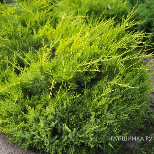 Можжевельник китайский Куривао Голд - сильнорослый хвойный кустарник с ажурной широкой, часто асимметричной кроной. Высота взрослого растения 1,5-2м и столько же в диаметре. Ветви широкие, раскидистые, растут вверх. Молодые побеги яркого золотистого цвета очень декоративно выглядят на фоне более зеленой чешуйчатой хвои. Годовой прирост до 15 см в год.