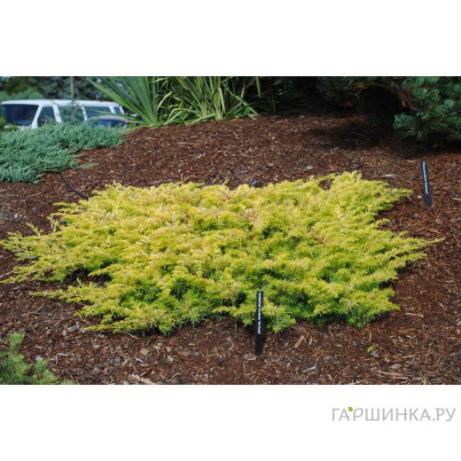 Можжевельник средний Голдфирн - медленнорастущее, вечнозеленое, хвойное растение природный карлик . Во взрослом состоянии, при соблюдении благоприятных условий выращивания вырастает до 0,5 м. Ветви короткие, тонкие, направлены вертикально. Хвоя мелкая, чешуйчатая, густая , ярко-желтая. Крона раскидистая, стелющаяся. Регулярная обрезка способствует формированию сплошного плотного ковра.