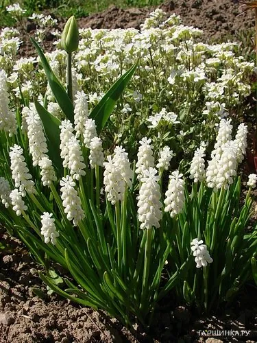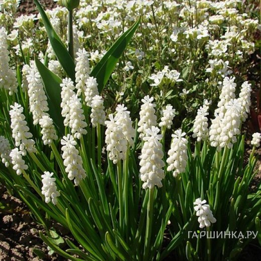 Мускари Alba Очень трогательный маленький мускари чисто белого цвета. Цветоносы многоцветковые высотой до 12 см. Мелкие цветки 0,4-0,6 см длиной и 0,3 см шириной собраны в кисти. Цветет в мае 15-20 дней. В природе распространен в Средней и Южной Европе; растет на лугах и по склонам гор. Зимостоек без укрытия.
