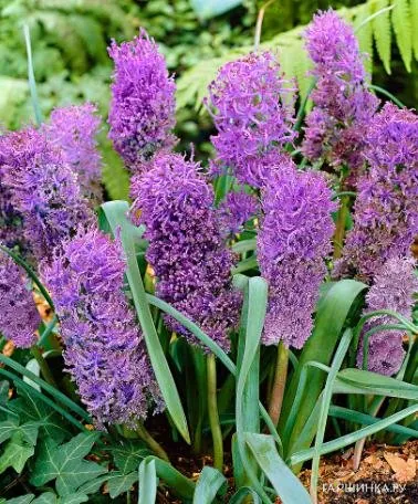 Мускари Plumosum цветет пушистыми сине-фиолетовыми цветками. Они очень привлекательные, имеют непревзойдённый аромат. Данный сорт очень похож на миниатюрные гиацинты. Высота растения 20 см. Зацветает в июне. Зона зимостойкости 5 (-29 / -23 °C)