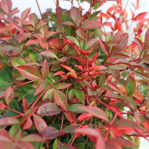 Нандина домашняя Обсессед - один из лучших компактных кустарников для круглогодичной декоративности. Красная окраска молодой листвы и побегов сохраняется 12 месяцев в году. Весной молодая листва и побеги ярко-красные, осенью-зимой становятся темно-красными. Куст плотный, округлый. Не требует обрезки. При правильной зимовке растение еще и цветет. Начинается кружевное цветение в июне и длится всего лишь несколько недель. Мелкие цветки удивительно оригинальны: белые чашелистики отклонены назад, подчеркивая шесть массивных тычинок вокруг пестика. Несмотря на мелкие размеры, цветки очень красивы. Но еще больше удивляет размер соцветий: необычные цветки собраны в очень крупные и полупрозрачные ажурные метелки соцветий, длина которых может превысить 30 см.