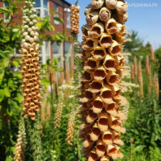 Наперстянка ржавая Гелбер Херолд - исключительно декоративный вид высотой в среднем 70 см, но может вырастать и выше человеческого роста. У нее с легким опушением или голые продолговато-ланцетные листья. Цветы по своей красоте и форме чем-то напоминают орхидеи и могут быть различной окраски (вид очень изменчив): светло-желтого цвета с розовым налетом или желто-серые, переходящие в необычный золотисто-коричневый или ржавый, венчик внутри украшен узором из красновато-коричневых или лиловых жилок, нижняя губа явно выражена. Цветки не очень крупные (до 4 см длиной), но многочисленные, собраны в крупные соцветия. Цветет растение со второй половины июня до августа, зацветает на второй год после посева. Наперстянка ржавая – многолетнее растение, но может вести себя как двулетник. Зимует без признаков повреждения. Ее также используют в лекарственных целях.