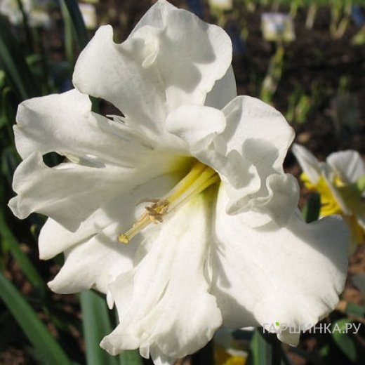 Нарцисс Colblanc разрезнокорончатый. Цветегние с конца апреля по начало мая. Венчики достигают в диаметре 11см, они эффектно смотрятся на не очень высоких, не больше 40см, цветоносах. Лепестки белоснежные, волнистые, доли короны разрезанные. Основания тычинок и внутренних лепестков желтоватые.