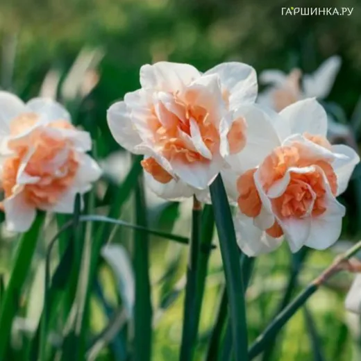 Нарцисс Дельнашо махровый 2шт - Окраска цветов – бело-персиковая. По диаметру цветы могут достигать около 8 – 10 см. В высоту такой нарцисс может вытянуться до 30 – 40 см. Радует ранним цветение - в апреле и до конца мая.