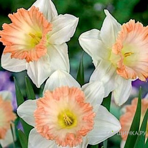 Нарцисс British Gamble зацветает в апреле. На цветоносах высотой 30 см, красуются огромные цветки размером 12 см, с короной высотой 3-4 см. Лепестки фарфорово-белые с желтым оттенком у основания, а по краю коронки идет нежно-розовая кайма.