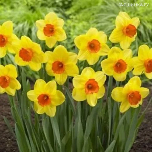 Нарцисс Red Devon крупнокорончатый. Лепестки золотисто-желтого цвета увенчаны крупной гофрированной коронкой, оранжевой с красным краем. Высота растения: 40 см . Местоположение: солнце, полутень.