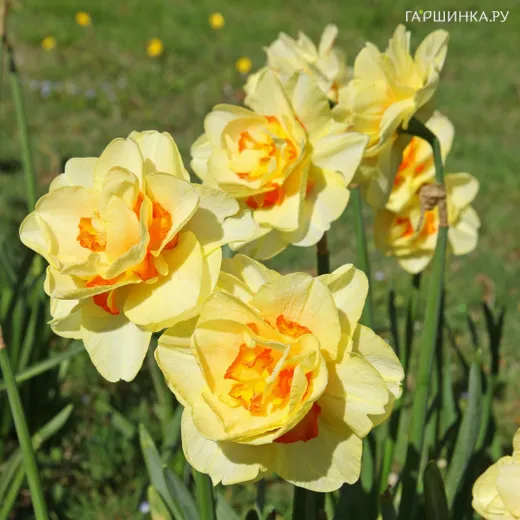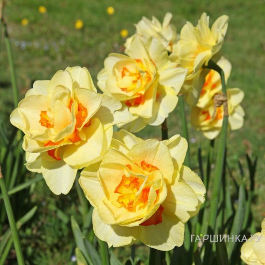 Нарцисс Tahiti - невероятно эффектный махровый нарцисс, с пышными ярко-желтыми цветками и коралловым центром. Высота растения 30-45 см, цветки 10 см в диметре, Цветение в апреле-мае.
