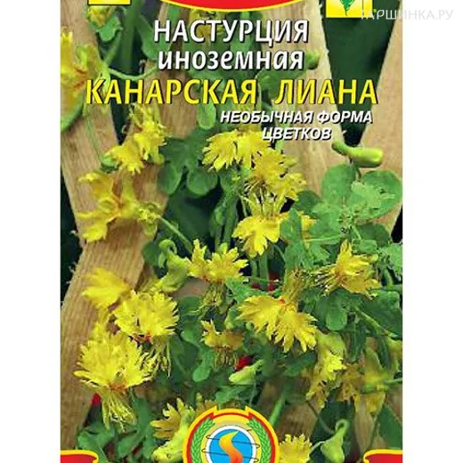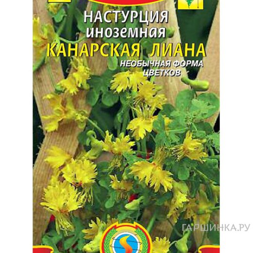 ОДНОЛЕТНИК Эффектное быстрорастущее однолетнее травянистое растение с экзотическими цветками и красивыми разрезными листьями. Стебли до 200 см длиной, светло-зеленые. Листья небольшие, пяти-семираздельные. Цветки мелкие, диаметром 4 см, канареечно-желтые с гофрированными лепестками и зелеными шпорцами. Прекрасно подходит для вертикального озеленения, великолепное украшение для беседок и шпалер.